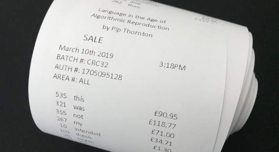 Arcadia (2020) : Benjamin at the Mall Fruitmarket Gallery Bookmarket, Waverley Mall, Edinburgh EH1 1BQ 6th Feb – 29th March 2020 / Preview 5th Feb 6-8pm Arcadia (2020) comments on the role of digital capitalism in the virtual and physical spaces of modern consumerism. Text from Walter Benjamin’s Arcades Project (1939) is fed through Google’s advertising platform and displayed as if the words were commodities … Continue reading Arcadia (2020)