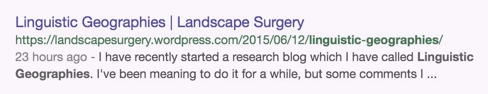 But yesterday was a long time ago on the internet, and as of this morning there is a new entry to the (bottom of the) first page of Google search results for ‘Linguistic Geographies’. As I suspected might happen, however, it is as a result of yesterday’s Landscape Surgery blog, and not my own site. Although the Right to be Forgotten and other cases involving Google have reminded us that ‘Google is not the Internet’, it is how over 90% of the UK population access online information. To all intents and purposes, https://linguisticgeography.wordpress.com/, still does not ‘exist’…