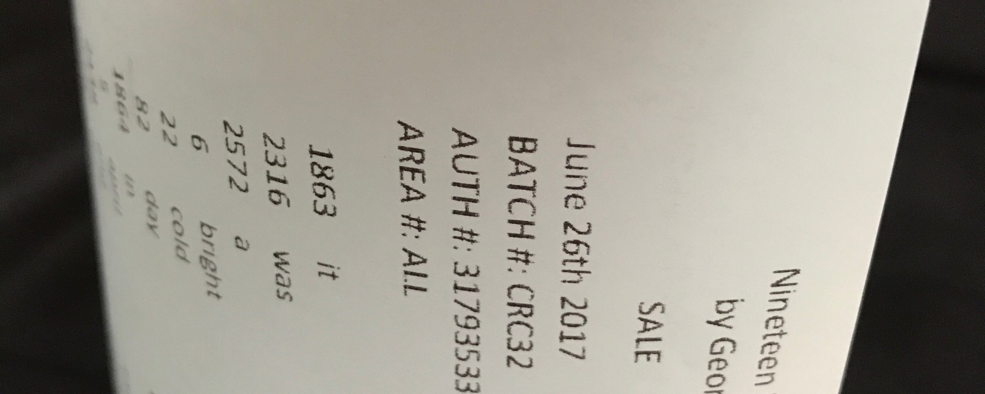 I’ll be doing some live demos over the next couple of weeks – first as part of the Museum of Contemporary Commodities session at the RGS-IBG on Friday 1st September, then as part of the Inter/sections exhibition at Mile End Arts Pavilion from 3-8th September, where I will be showing a framed collection of the poem.py receipts for the very first time. Finally, on 2nd October, I’ll be presenting alongside the brilliant Louise Amoore and Pip Willcox at the Testing Turing event at the British Library in London. Exciting times!